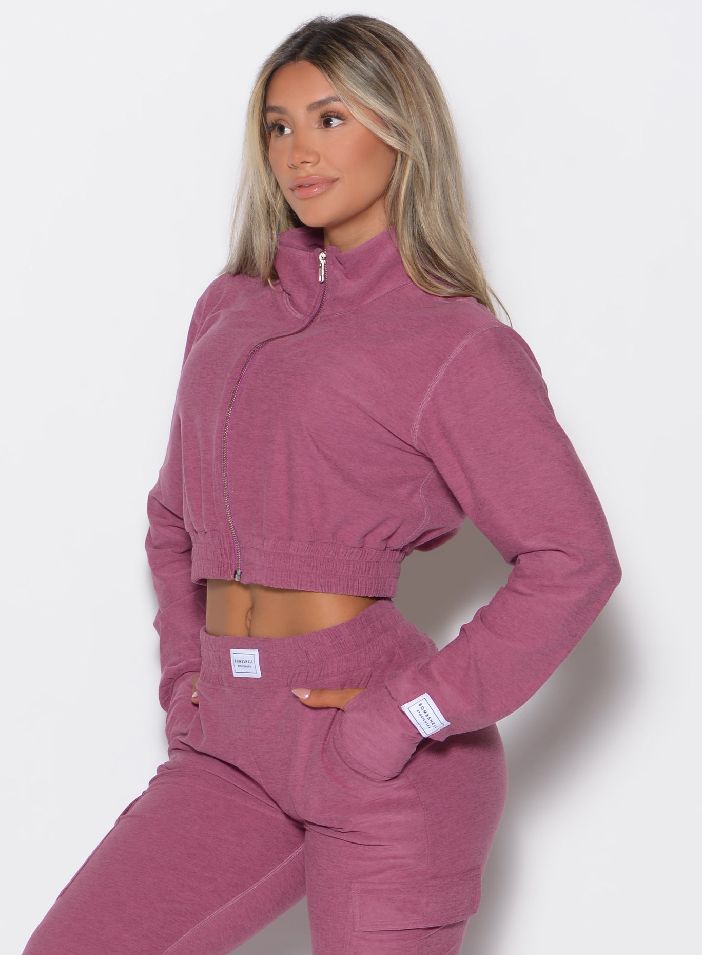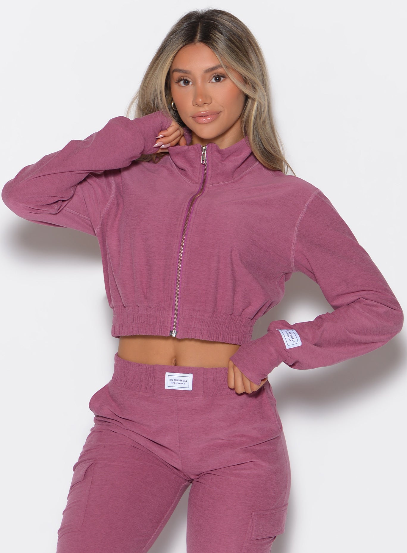 Meet the Cloud Crop Jacket. your go-to for everyday wear and lounging. With a mock high neck and full zip front. this jacket is both versatile and stylish. Thumb holes and scrunch detail add a contemporary touch. while the flatlock detailed stitching enhances durability. Made from light. airy fabric. it’s incredibly comfortable and pairs perfectly with our cloud shorts. Finished with a woven branded label. this jacket combines practicality with a chic. modern look and pairs perfectly with our cloud shorts and joggers.