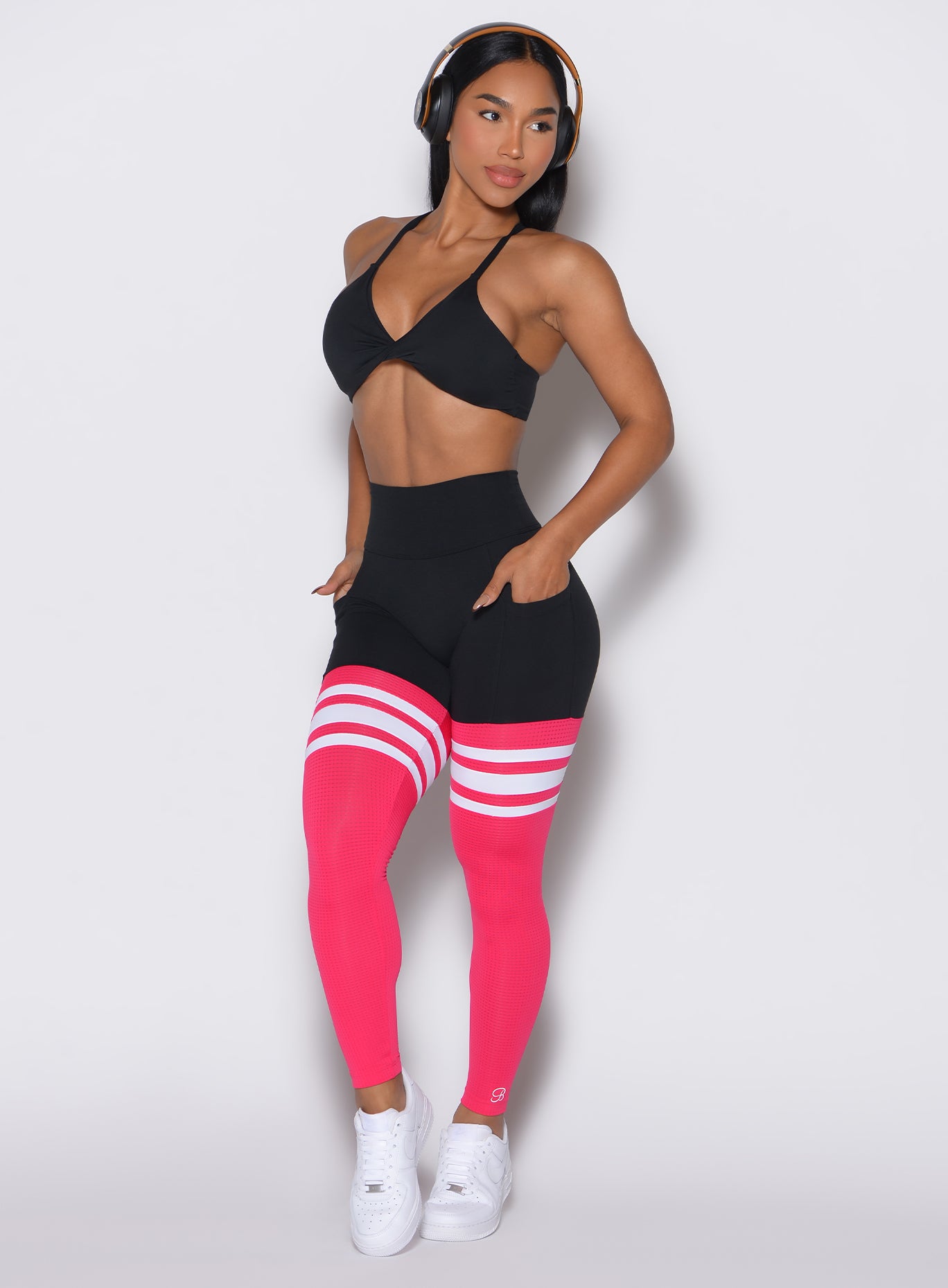 Bombshell’s Design Patented Thigh-Highs with pockets and no front seam! Sleek and sexy. these fresh leggings are made for workouts and beyond. Constructed with our buttery soft Second Skin fabric with super 4 way stretch in every direction. A body hugging flattering fit combined with mesh to keep you cool during your workouts.